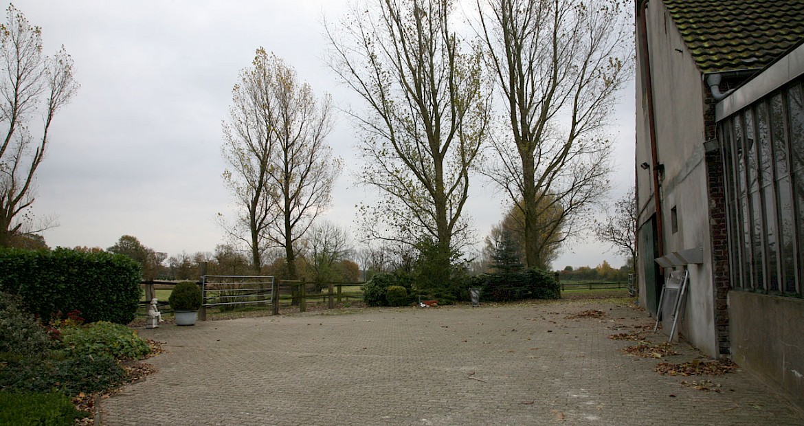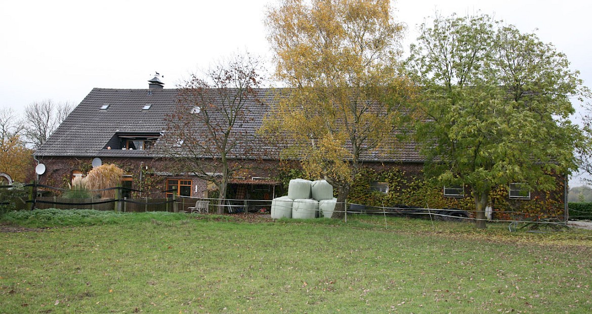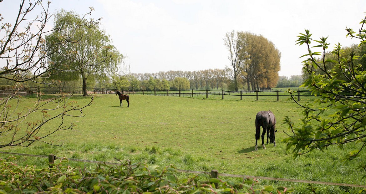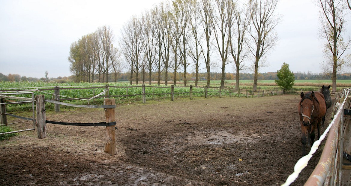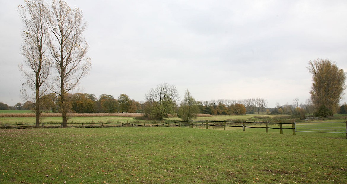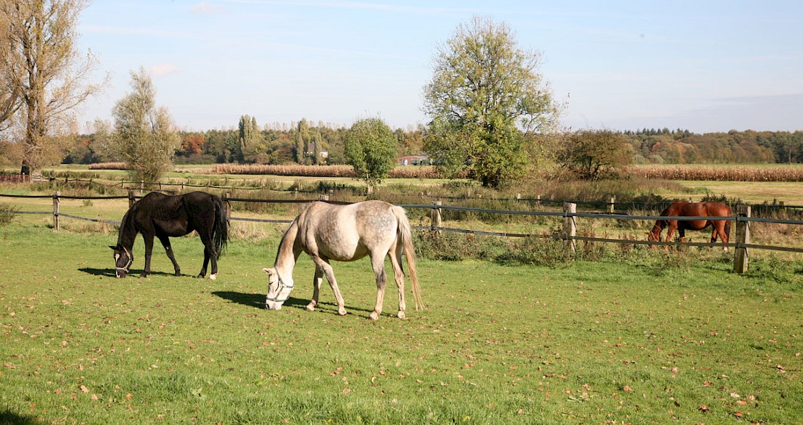 Die Weideflächen erstrecken sich südlich der Hofgebäude und liegen geschützt zwischen Bäumen und Sträuchern, sowie dem Fluß Niers.