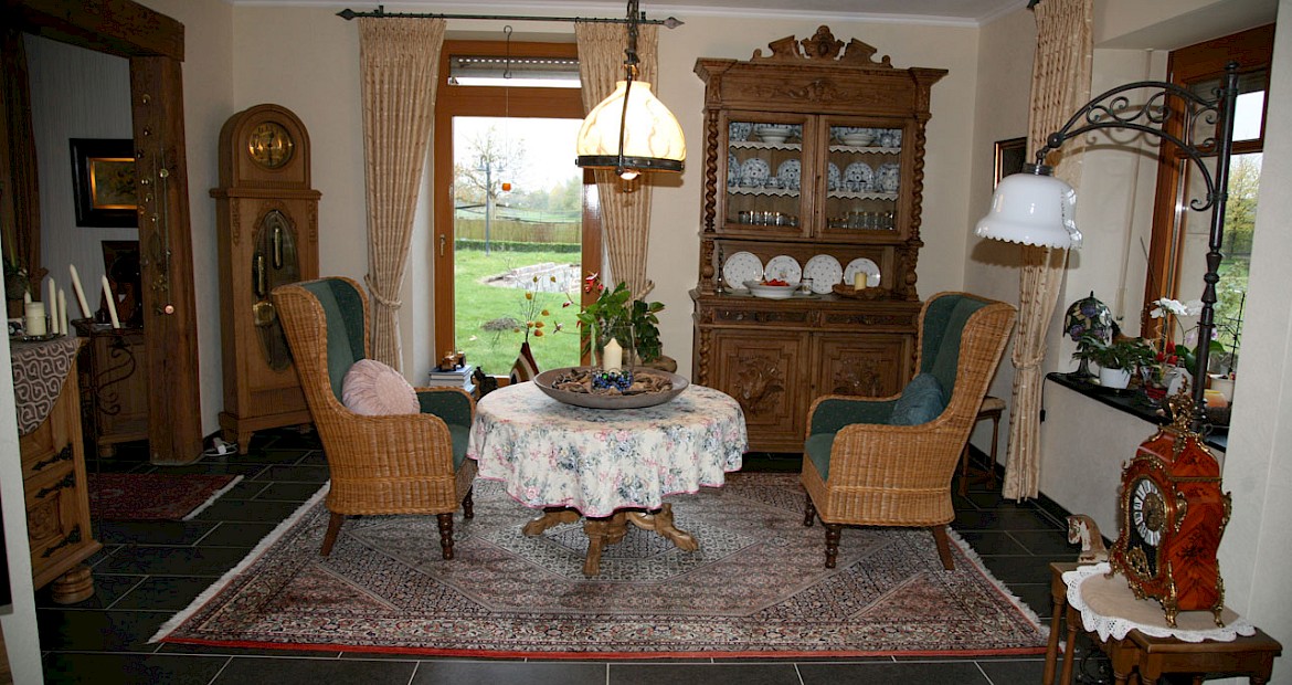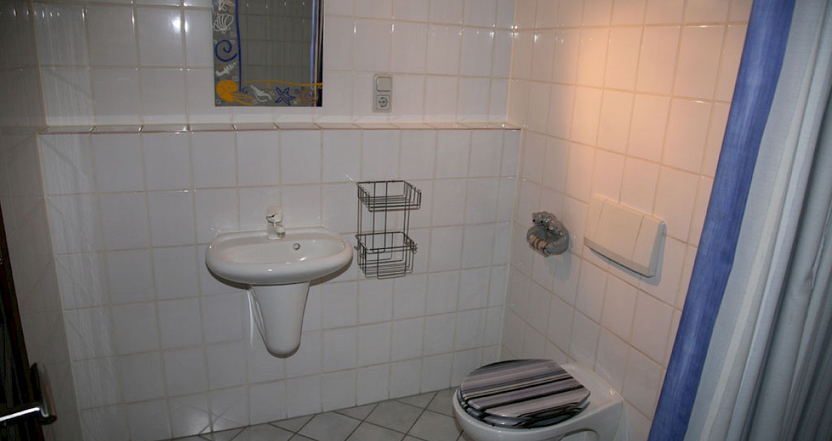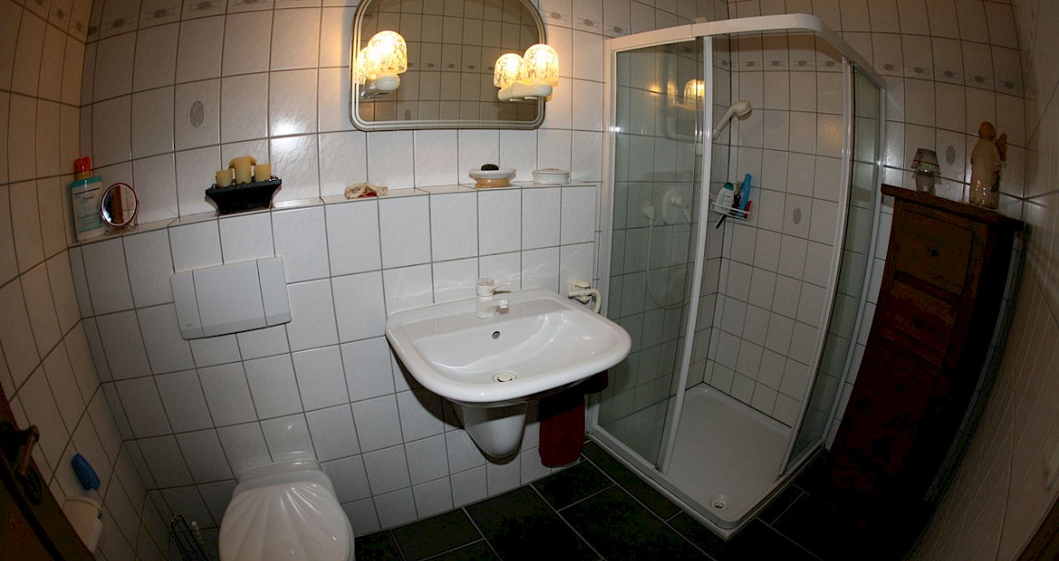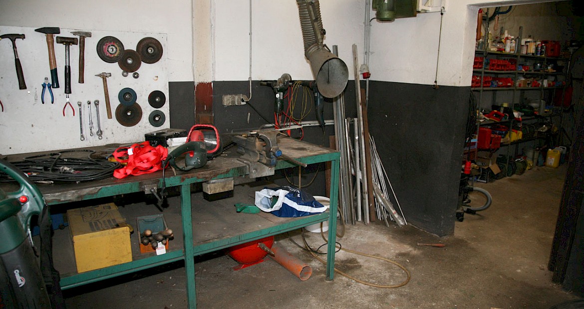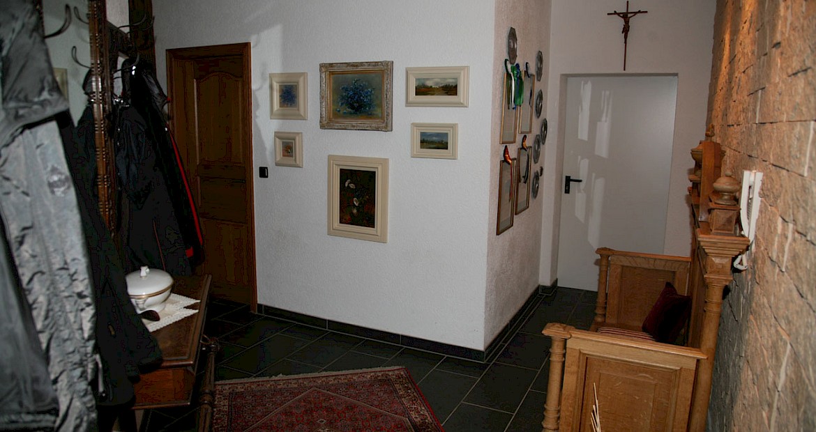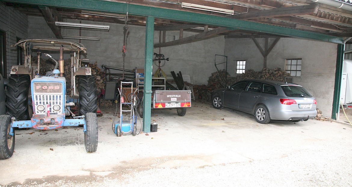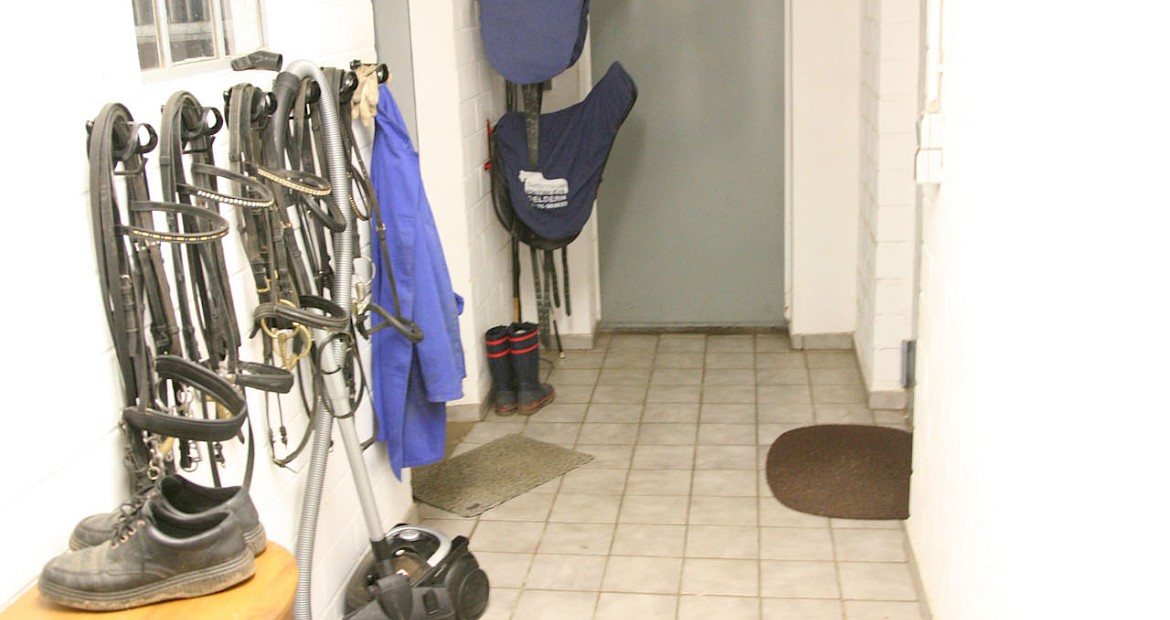 Im Hauptgebäude, zwischen Wohnungen und Stall, befindet sich ein praktischer Trakt. An diesen Gang schließen sich Vorratskammer, Waschküche und das auch von außen erreichbare "Reiter-WC" an. Hier, in einem Anbau, befindet sich auch eine Einzelgarage.