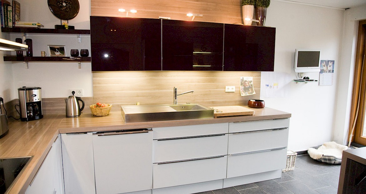 Holzdielen auf „Empore“, Holzdecken - außer Bad und Gäste-WC, Decke von Bad und Gäste-WC weiße Paneelen, Bad: Dusche, Eckbadewanne mit Sitzmöglichkeit, Küche, Bad, Abstellraum, Gäste WC gefließt, komplette, moderne Einbauküche, Waschmaschinen- und Trocknerstellmöglichkeit in Gäste-WC, Jalousien (außer Bad), hellbraune Holzfenster von 2003, Gegensprechanlage,mit der auch das Außentor geöffnet werden kann, Metalltreppe mit Holzstufen (zw. OG u. DG).
