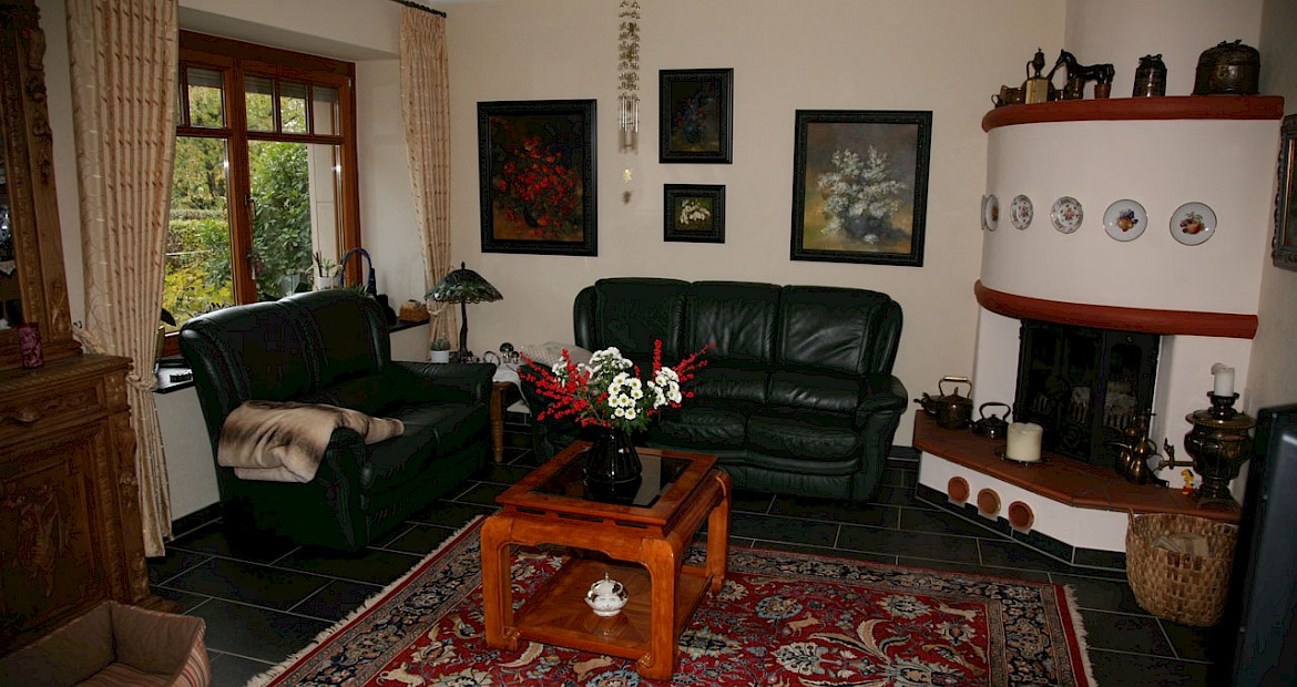 Die 2011 modernisierte EG-Wohnung ist großzügig geschnitten in Wohnzimmer, Esszimmer, Küche, 2 Schlafzimmer, Badezimmer, Gäste-WC/Dusche und Flur unterteilt. Von Küche, Wohnzimmer und Esszimmer gelangt man auf die Süd-Terrasse (mit elektrischer Markise) und in den Garten (mit Springbrunnen). Von hier aus läßt sich der Blick auf das eigene Idyll besonders genießen.