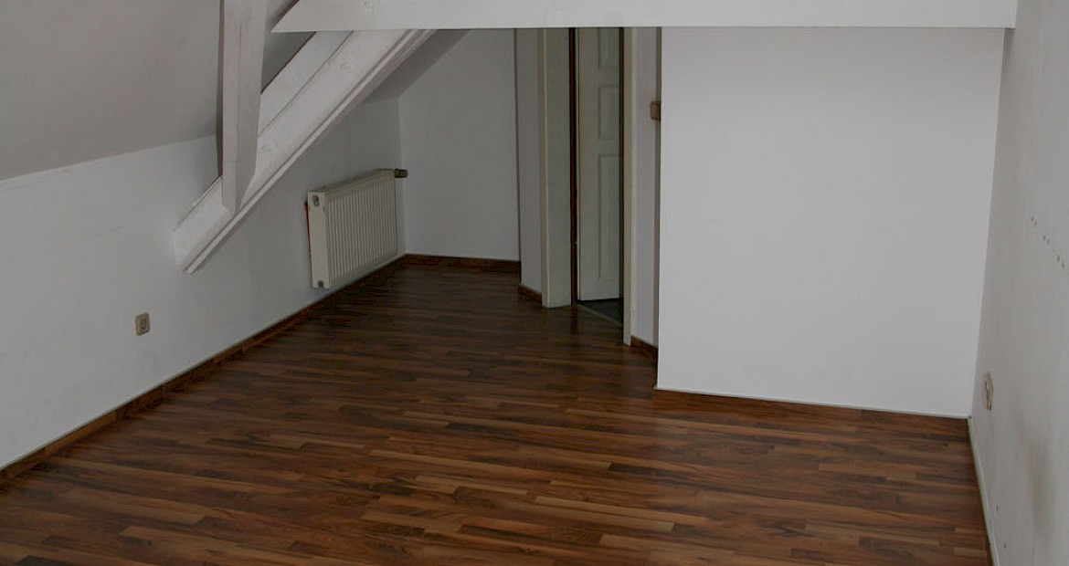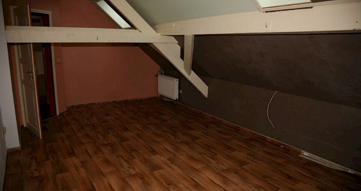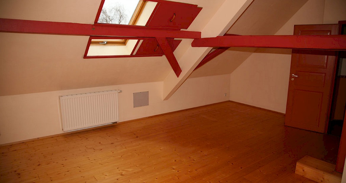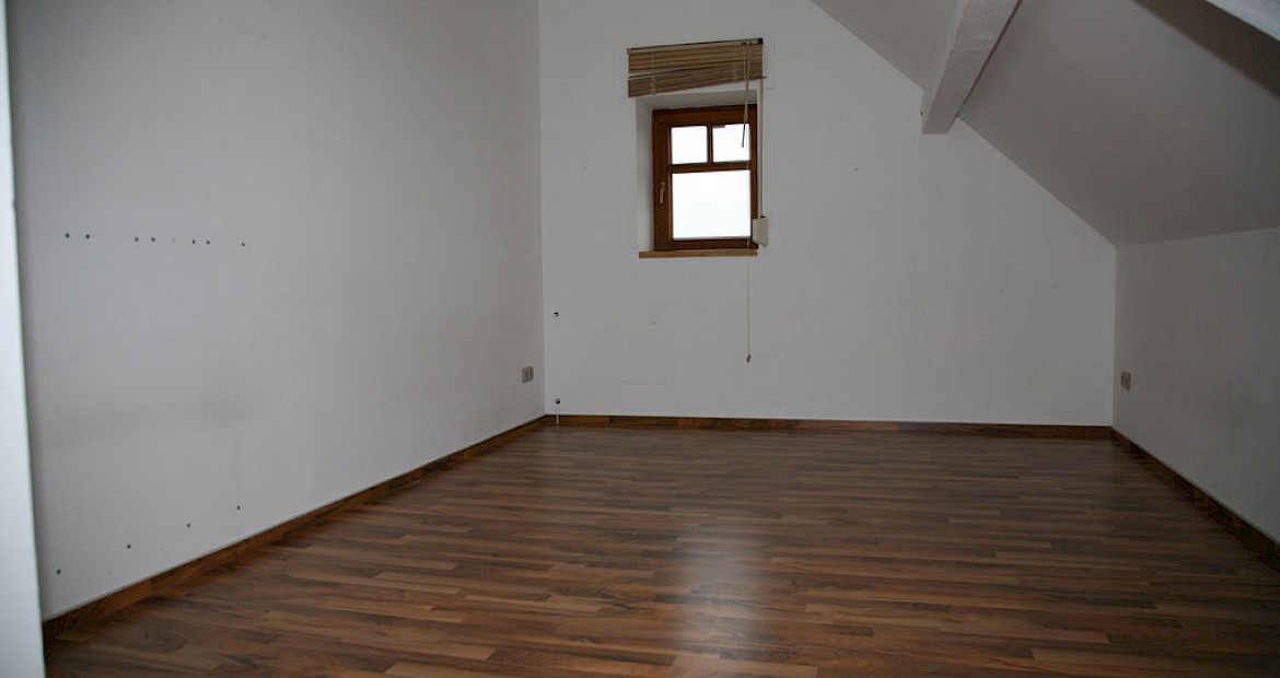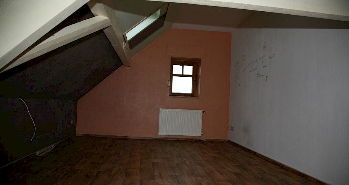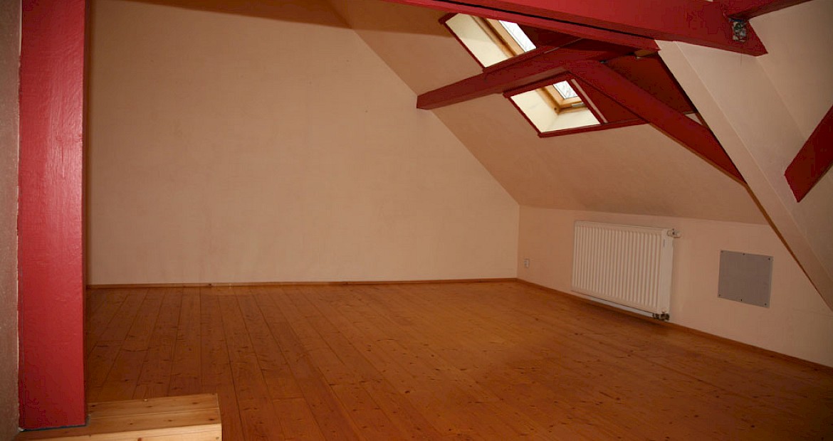 Im Spitzboden sind weitere drei Schlafzimmer und ein Speicher bzw. Abstellraum vorhanden. Diese Räume sind aufgrund tiefhängender Holzbalken bei der Wohnflächenberechnung nicht berücksichtigt. Ohne die drei Balken würde die Wohnfläche ca. 50 m² betragen. Zuvor wurden diese Räumlichkeiten als Kinderzimmer genutzt.