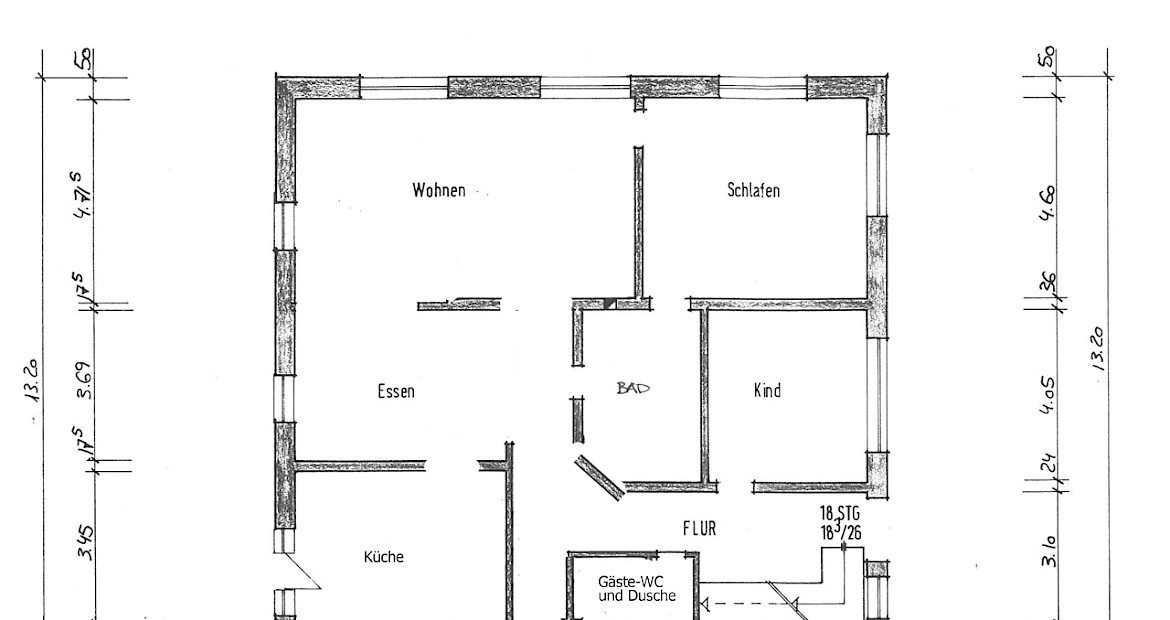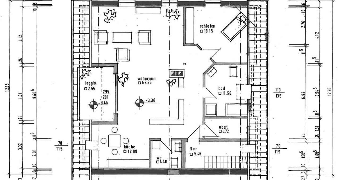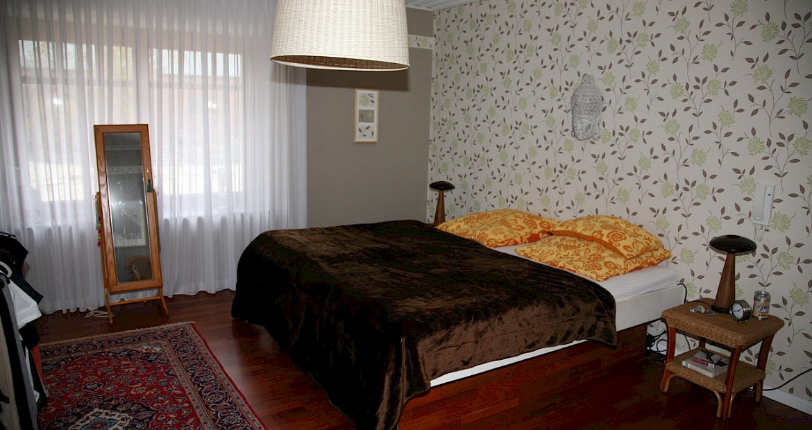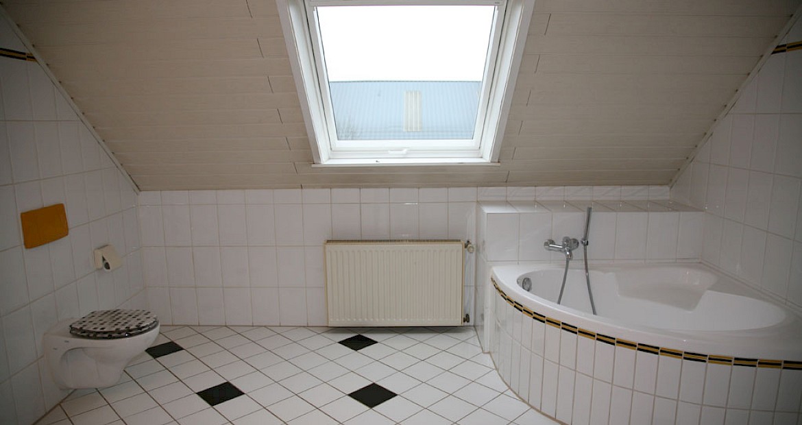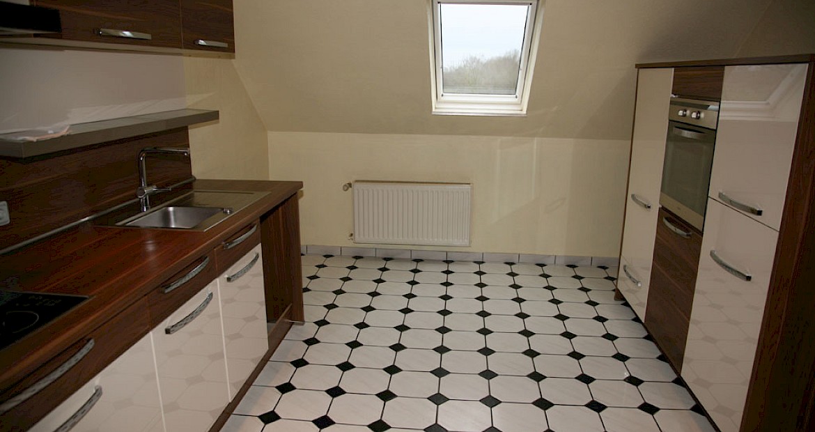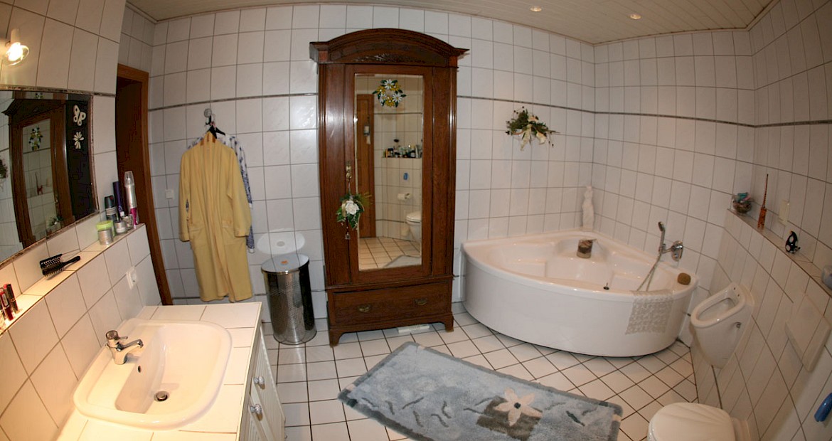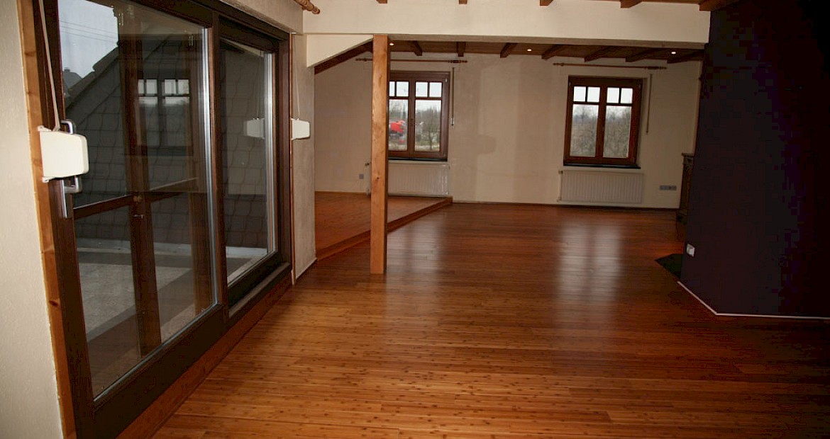 Im Spitzboden sind weitere drei Schlafzimmer und ein Speicher bzw. Abstellraum vorhanden. Diese Räume sind aufgrund tiefhängender Holzbalken bei der Wohnflächenberechnung nicht berücksichtigt. Ohne die drei Balken würde die Wohnfläche ca. 50 m² betragen. Zuvor wurden diese Räumlichkeiten als Kinderzimmer genutzt.