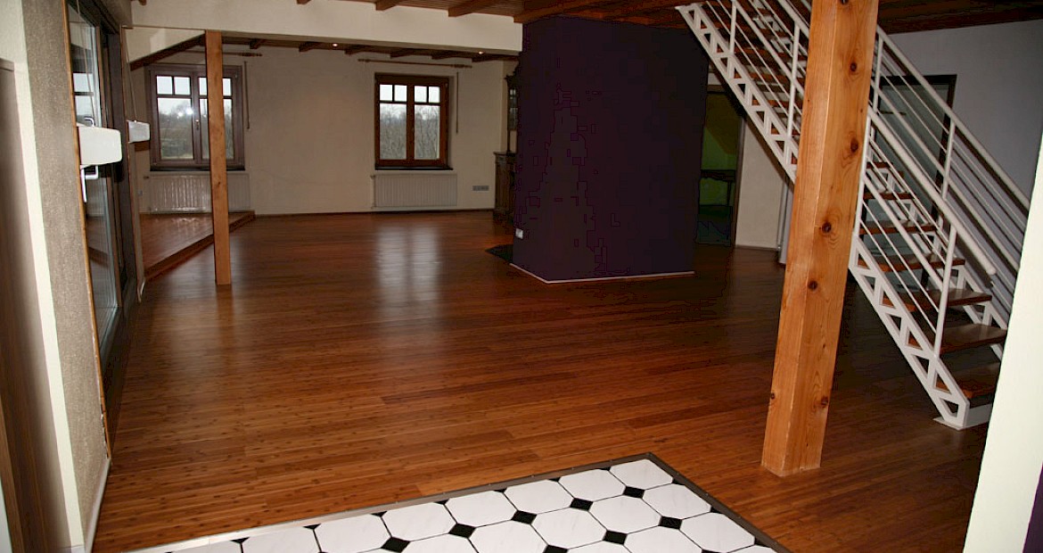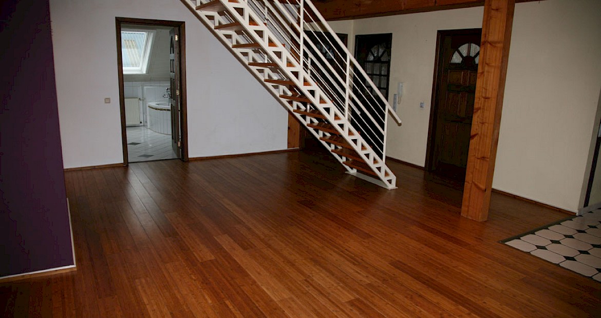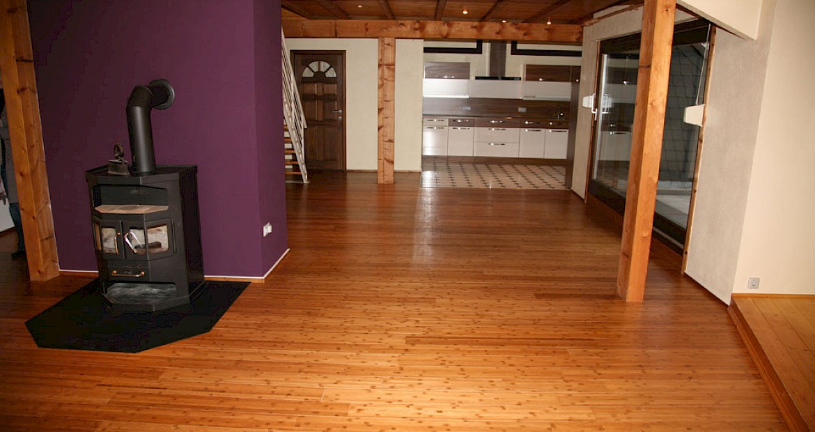 Auszugsweise Ausstattung der Wohnung: Holzkaminofen, Bambusparkett in Wohn- und Essbereich.