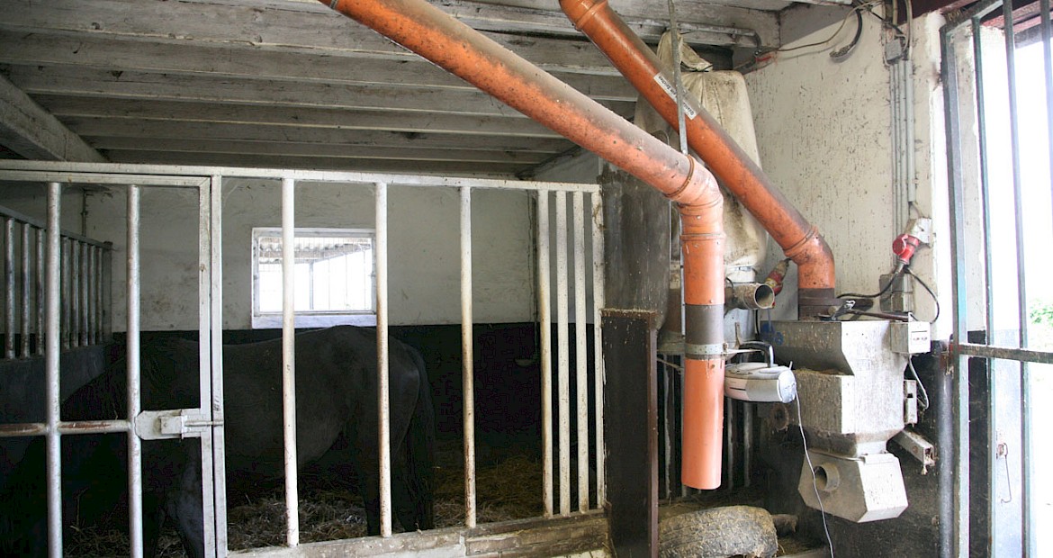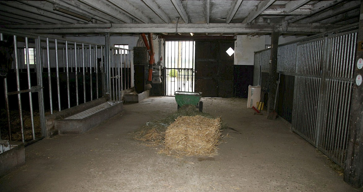 Der Stall (22 m x 13,75 m) ist direkt über das Wohnhaus oder über ein großes Holzschiebetor zu erreichen. Er verfügt über 11 Boxen, 2 innenliegende Futtersilos und 1 Haferquetsche. Der darüber liegende Speicher (dort sind die Silos) bietet mit der gleichen Grundfläche und der maximale Höhe (Satteldach) von 6,85 m enorm viel Nutzfläche.