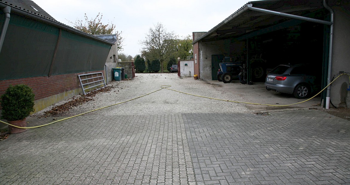Der große, beleuchtete Vorderhof bietet viele Stellplätze. Dieser Bereich zwischen Obstgarten, Reithalle und Haupthaus ist mit hellem Kies versehen.
