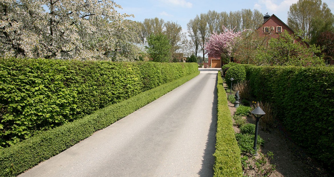 Über eine langgestreckte, flankierend bepflanzte Zufahrt gelangt man auf das Anwesen. Das große Außentor ist elektrisch fernbedienbar.