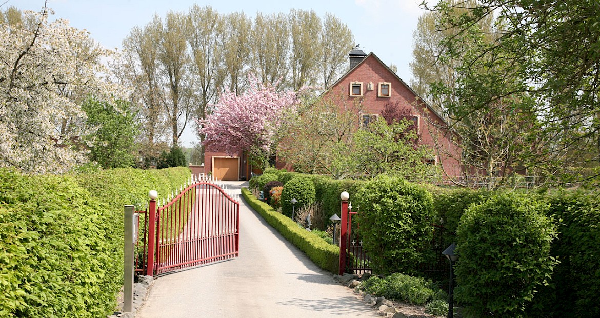 Über eine langgestreckte, flankierend bepflanzte Zufahrt gelangt man auf das Anwesen. Das große Außentor ist elektrisch fernbedienbar.