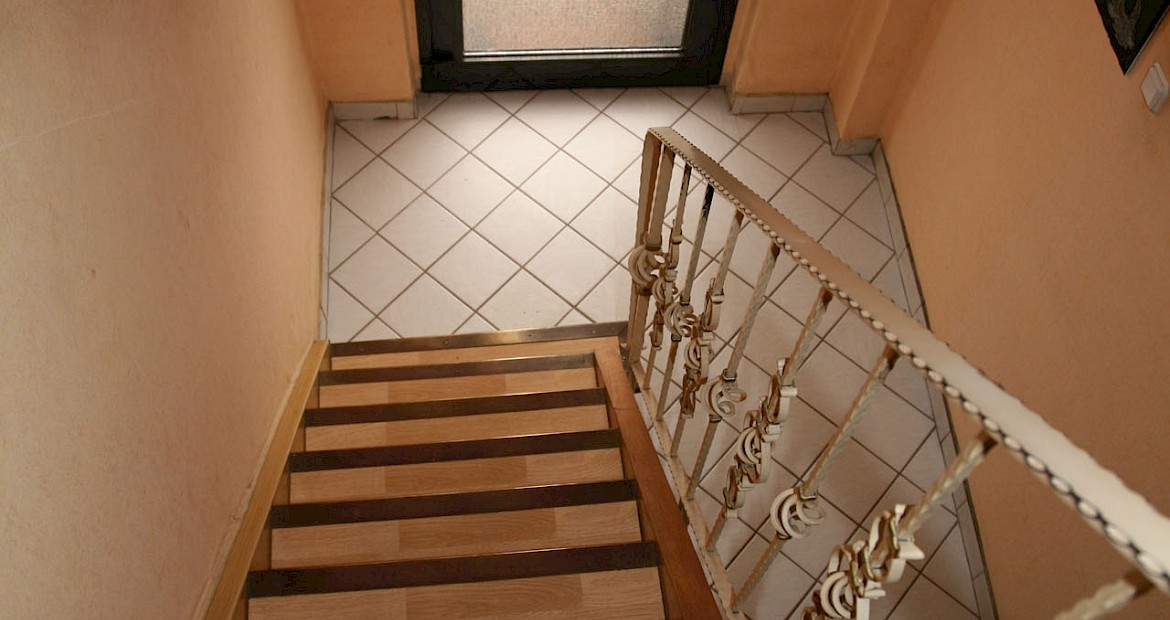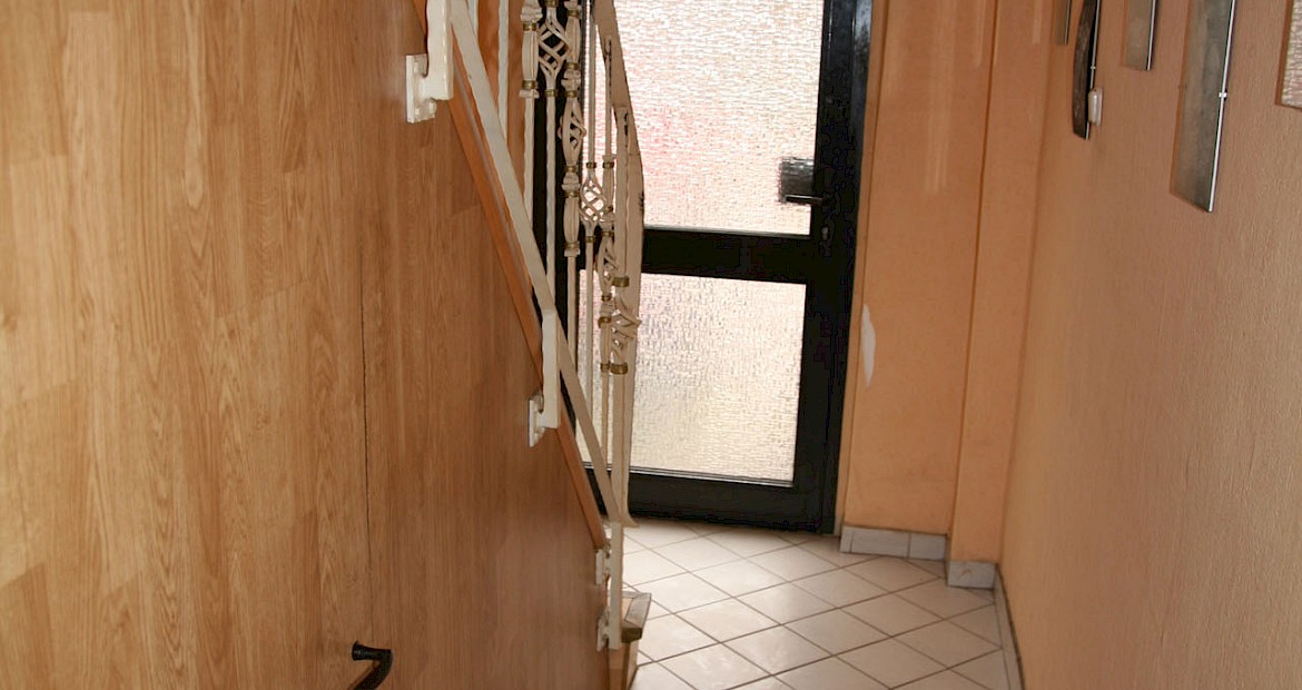 Das Reihenhaus verfügt über ca. 130 m² Wohnfläche und wurde auf einem 164 m² großen Grundstück in Massivbauweise, 2,5-geschossig und teilunterkellert errichtet. Das Einfamilienhaus ließe sich mit wenig Aufwand als Zweifamilienhaus nutzen.Im Erdgeschoss befinden sich ein großes Wohn- und Esszimmer, eine Küche, sowie ein innenliegendes Badezimmer mit Dusche. Das Wohnzimmer ist vom Esszimmer aus durch einen Rundbogen optisch getrennt. Beide Räume verfügen über Laminatboden und isolierverglaste Fenster. Die Küche, sowie das Badezimmer sind jeweils gefliest.