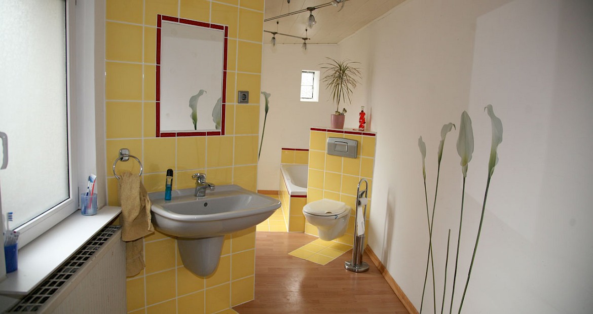 Zwei Schlafzimmer und ein zweites Badezimmer befinden sich im 1. Obergeschoss. Das große Elternschlafzimmer verfügt über einen Balkon und ausreichend Platz für einen Ankleidebereich. Das Badezimmer mit Badewanne und eigenem Balkon(!) wurde von den derzeitigen Eigentümern renoviert.