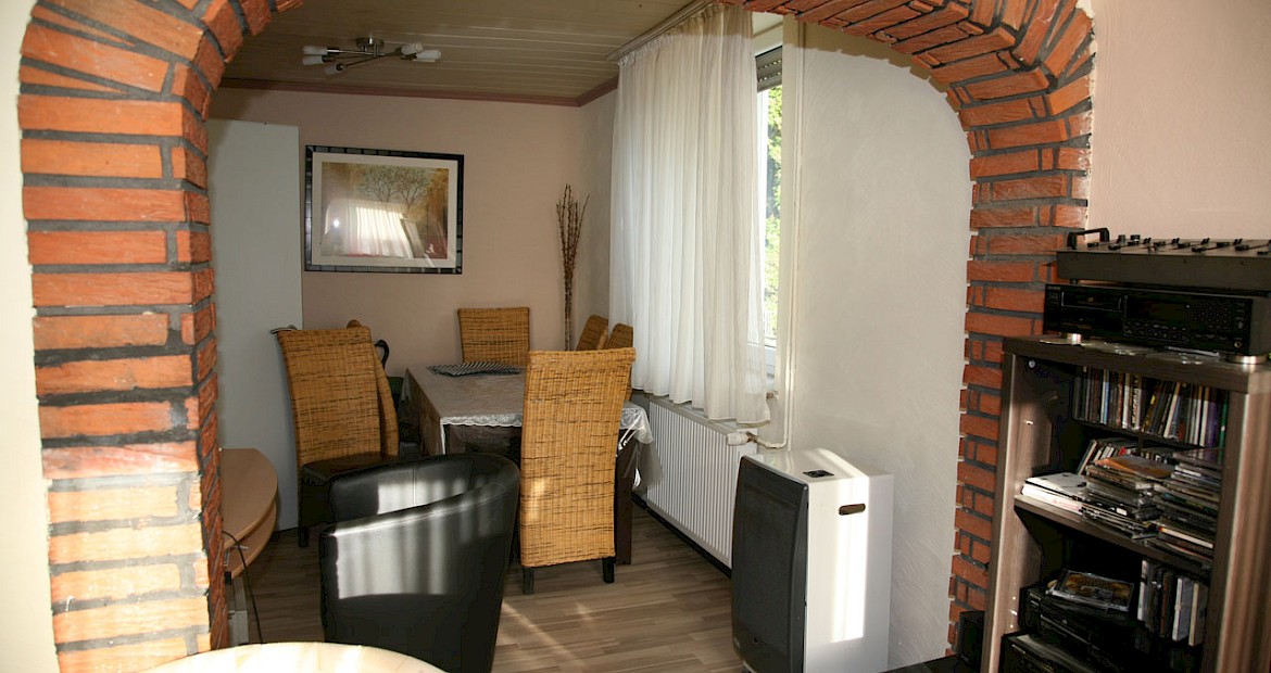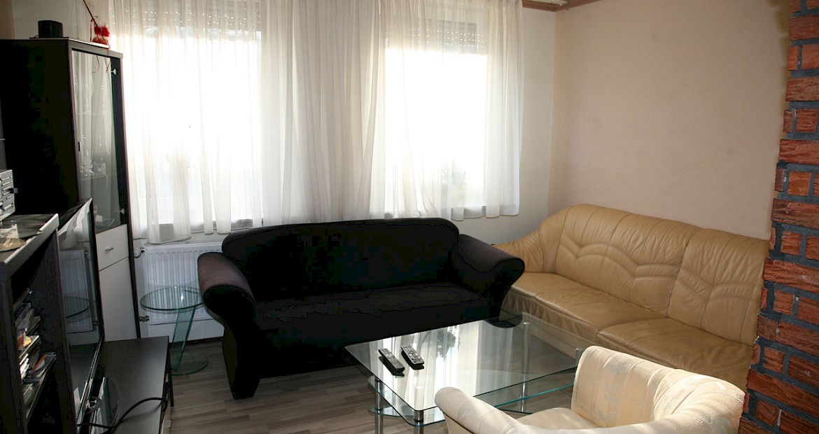 EG-Wohnung: 1 Wohn- und Esszimmer, 1 Schlafzimmer, 1 Küche, 1 Badezimmer (mit Fenster), 1 Hauswirtschaftsraum. Im EG und 1 überdachte Terrasse.